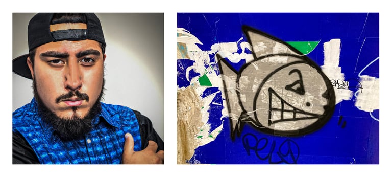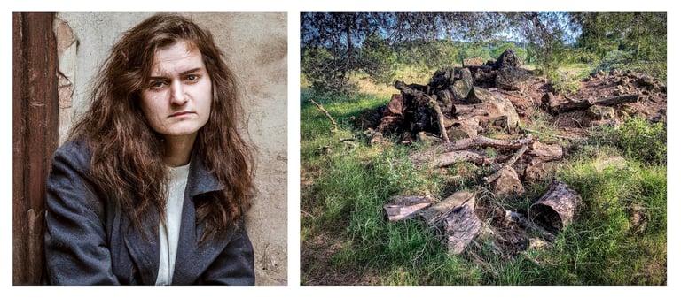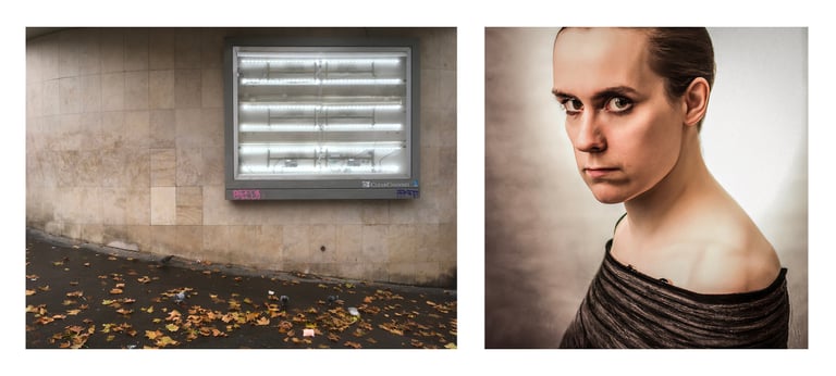 An AI-generated portrait associated with a photograph composes each of the diptychs in this series.